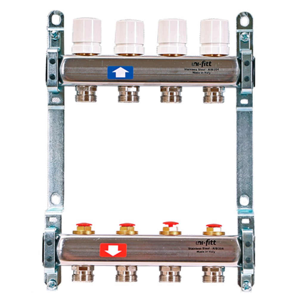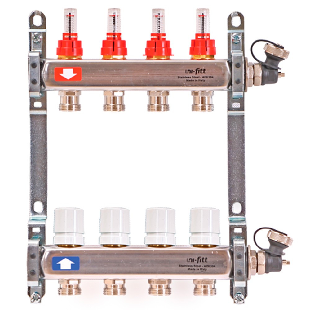 Группа коллекторная Uni-Fitt 1"х4 вых 3/4" с расходом. и термостат. вентилями без конц, нерж. сталь