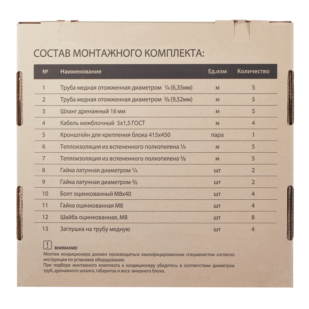 Комплект предназначен для кондиционеров 7000/9000 BTU, рассчитан на стандартную фреоновую трассу длиной 5м. Удобный кейс с ручкой включает в себя все необходимое: медную трубу в теплоизоляции, кронштейны, дренажный шланг, кабель, крепеж.