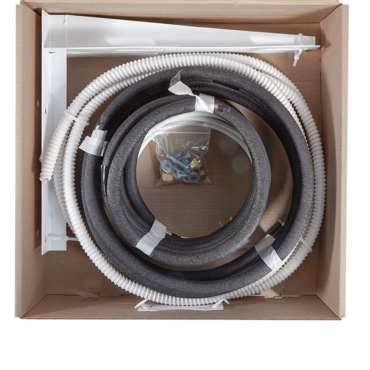 - Комплектность медная труба в теплоизоляции, кронштейны, дренажный шланг, кабель, крепеж