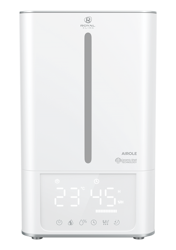 AIROLE (А́йроле) от ROYAL CLIMA — это многофункциональное решение для увлажнения воздуха в помещении. Ультразвуковой увлажнитель AIROLE обладает верхним заливом, благодаря которому наполнять резервуар водой стало комфортнее, без брызг и шума. AIROLE включает в себя 3 функции: интенсивное увлажнение до 300 мл/час, измерение температуры воздуха в помещении и измерение уровня влажности. Чтобы выбрать и установить желаемый уровень влажности, воспользуйтесь электронной панелью управления.