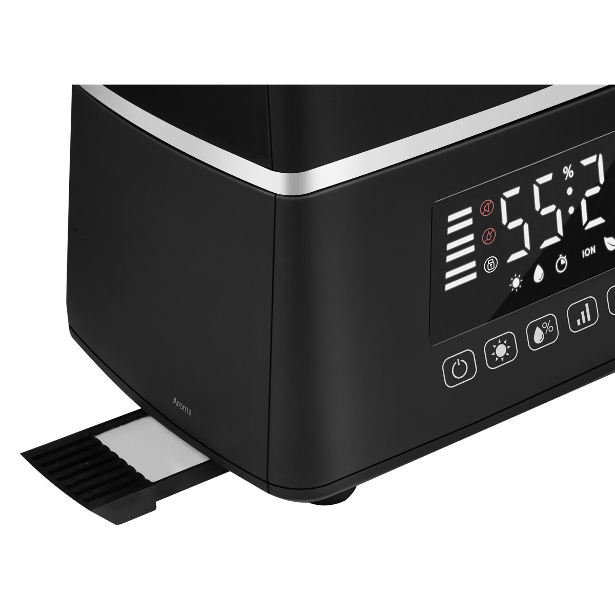 - Яркий, контрастный дисплей в режиме реального времени позволяет отследить текущий уровень влажности, остаток воды в резервуаре, установленные режимы работы