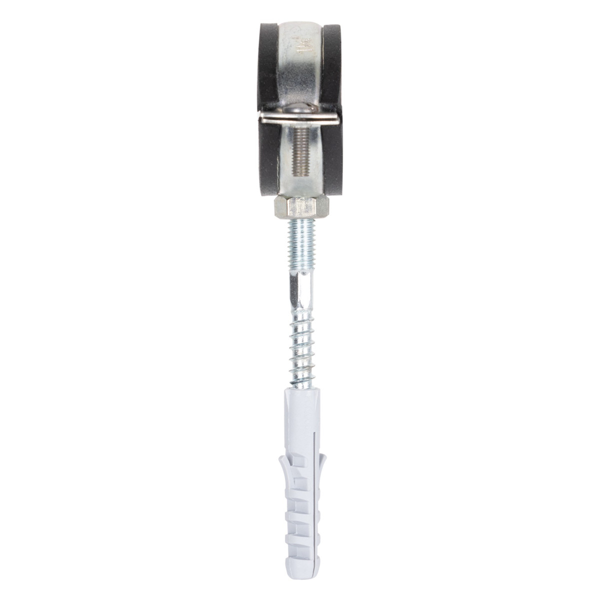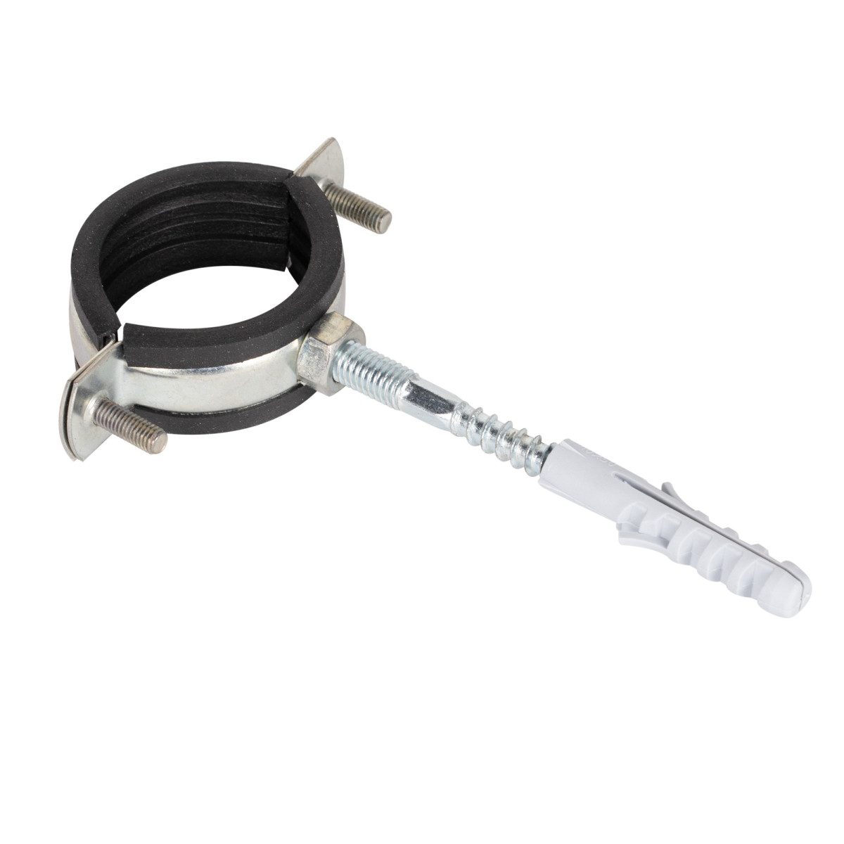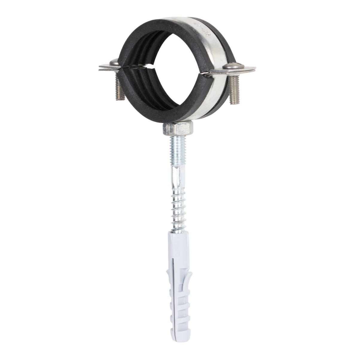 Металлический оцинкованный хомут для труб с резиновой прокладкой, болтом и дюбелем — это специальный крепежный элемент, используемый для надежной фиксации труб по различным направлениям.